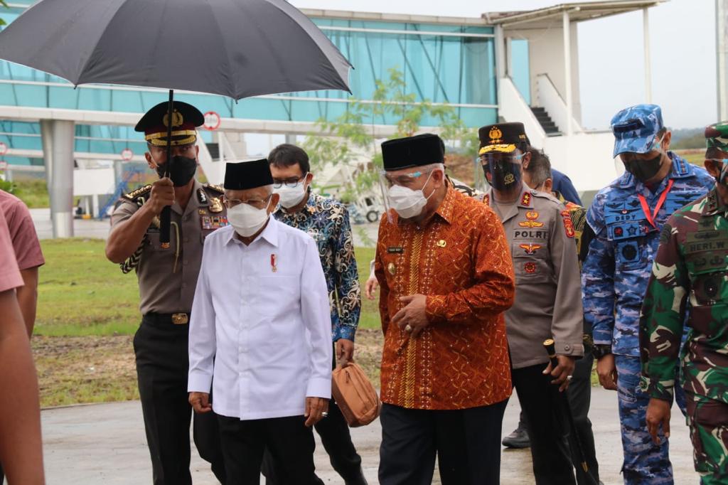 SAMARINDA, lingkaranberita.com – Mengenakan Batik Orange dan Kopiah Hitam, Gubernur Kaltim Dr H Isran Noor didampingi Forkopimda Kaltim, mulai Pangdam VI Mulawarman Mayjen TNI Heri Wiranto, Kapolda Kaltim Irjen Pol Herry Rudolf Nahak dan Danrem 091 ASN Birgjen TNI Cahyo Suryo Putro, Kabinda Kaltim Brigjen TNI Danni Koswara, Kapolresta Samarinda Kombes Pol Arif Budiman serta Forkopimda lainnya di Kaltim menyambut kedatangan Wakil Presiden (Wapres) RI2 KH Ma’ruf Amin di Bandara APT Pranoto Samarinda, Selasa 2 November 2021.