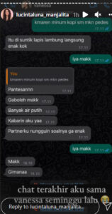Lucinta Luna juga membagikan pesan terakhir yang Vanessa kirimkan melalui pesan WhatsApp. Dalam tangkapan layar tersebut Vanessa tampak begitu perhatian kepada sahabatnya yang sedang terbaring sakit. “Ga boleh makk, banyak air putih” pesan Vanessa pada Lucinta “Alfatihah vanessa biblis semoga tenang di sisi Allah aminnn yaa robbal alamin 🙏🏻😘” tambah Lucinta pada unggahan tersebut.