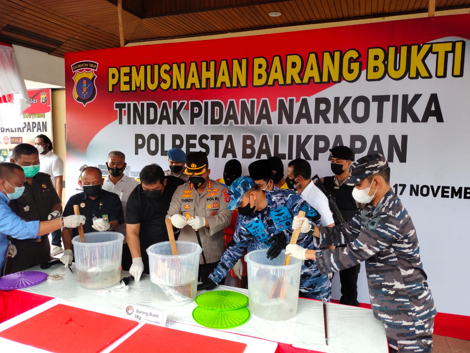 “Kita sudah saksikan bersama-sama pemusnahan narkotika jenis sabu-sabu seberat 3.1 Kg yang mana barang haram tersebut dari hasil pengungkapan yang dilakukan Polresta Balikpapan beberapa waktu lalu,” ujar Kombes Pol V Thirdy.