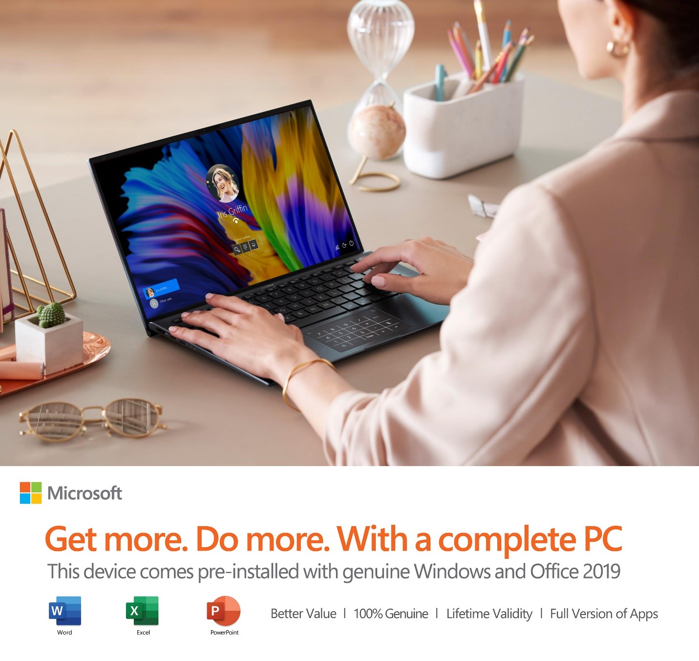 Office merupakan aplikasi penunjang produktivitas terbaik dan kini telah tersedia di ASUS ZenBook 14 Ultralight (UX435EAL). Nikmati semua manfaat dengan PC yang lengkap – PC sudah termasuk Office Home & Student 2019. Aplikasi Office versi lengkap (Word, Excel dan PowerPoint) memberikan semua fungsi yang dibutuhkan dan diharapkan oleh penggunanya.
