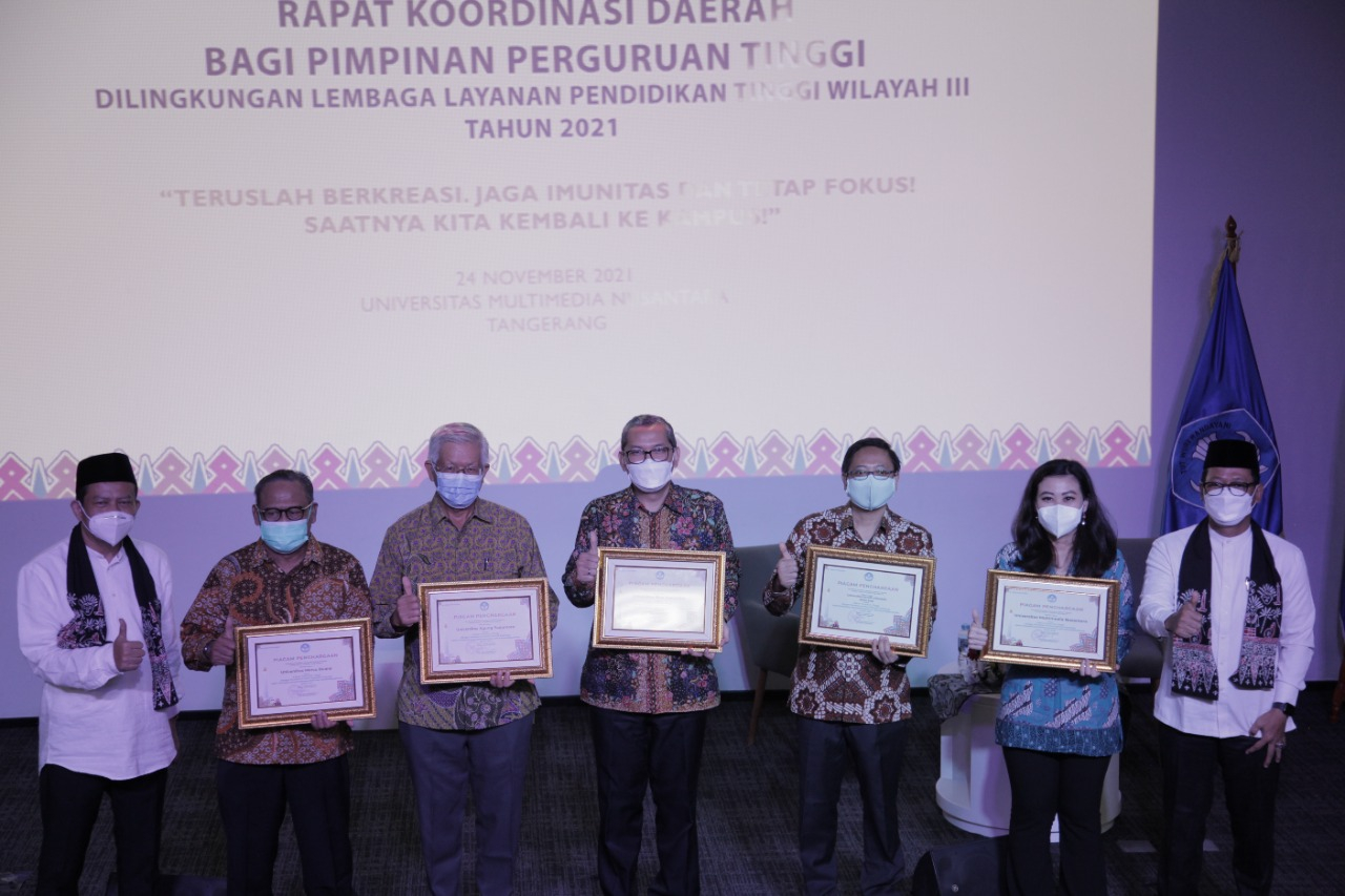 Penghargaan itu diserahkan Kepala LLDIKTI3 Prof Dr. Agus Setyo Budi, M.Sc kepada Rektor Universitas Mercu Buana, Prof. Dr. Ngadino Suritp, MS, pada Rapat Koordinasi Daerah (RAKORDA) Tahun 2021 LLDIKTI3 yang diadakan Rabu, 24 November 2021 di Ruang Lecturer Theatre P.K. Ojong – Jakob Oetama Tower,Tangerang Selatan.