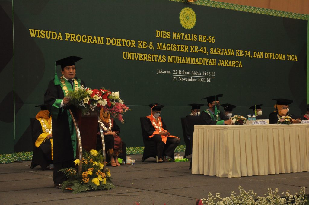 Selanjut ia juga berpesan. “Kami berharap meskipun secara administratif wisudawan dan wisudawati telah selesai menyelesaikan studi di Universitas Muhammadiyah Jakarta tapi kami tetap berharap ada jalinan komunikasi yang terus menerus dan alumni juga harus tetap menjalankan dakwah Islam dan kemuhamadiyahan dengan penyampaian dakwah Islam yang dilakukan secara moderat bukan dengan cara ekstrem,” harapnya.
