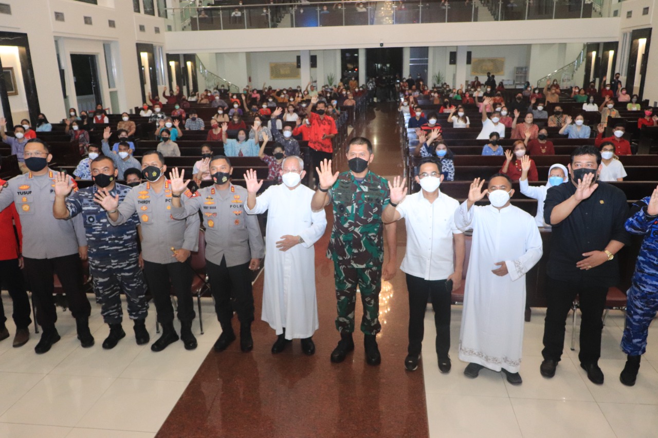LINGKARANBERITA.COM, BALIKPAPAN – Pangdam VI/Mulawarman Mayjen TNI Teguh Pudjo Rumekso bersama Kapolda Kaltim Irjen Pol Rudolf Nahak, Wali Kota Balikpapan Rahmad Mas’ud serta sejumlah pejabat Forkompinda Kota Balikpapan mengecek keamanan ibadah perayaan malam Natal 2021 di gereja- gereja di Kota Balikpapan, Jumat (24/12/2021) malam.