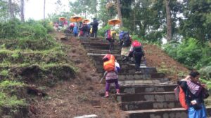 Suasana mistis akan mulai terasa ketika pendakian menuju Pos 1, yang mana saya dan teman-teman harus mendaki jalur bertangga yang mirip dengan pintu gerbang ke singgasana raja. Di kiri dan kanannya terdapat payung berwarna kuning emas yang sangat identik dengan atribut kerajaan, bahkan di pertengahan tangga terdapat juga patung yang ukurannya cukup besar dengan bentuk yang unik.