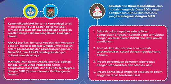 Menteri Nadiem mengatakan, sistem pengelolaan anggaran sekolah akan menyatu dengan sistem pengelolaan daerah. Selain itu, Sistem Informasi Pengadaan Sekolah (SIPLah) dan Data Pokok Pendidikan (Dapodik) Kemendikbudristek, juga akan terhubung dengan Sistem Informasi Pembangunan Daerah (SIPD). ARKAS yang dipakai sekolah akan terintegrasi otomatis dengan Manajemen ARKAS (MARKAS), yaitu aplikasi tunggal bagi dinas pendidikan untuk mengelola Dana BOS. MARKAS pun terintegrasi dengan SIPD Kementerian Dalam Negeri (Kemendagri).