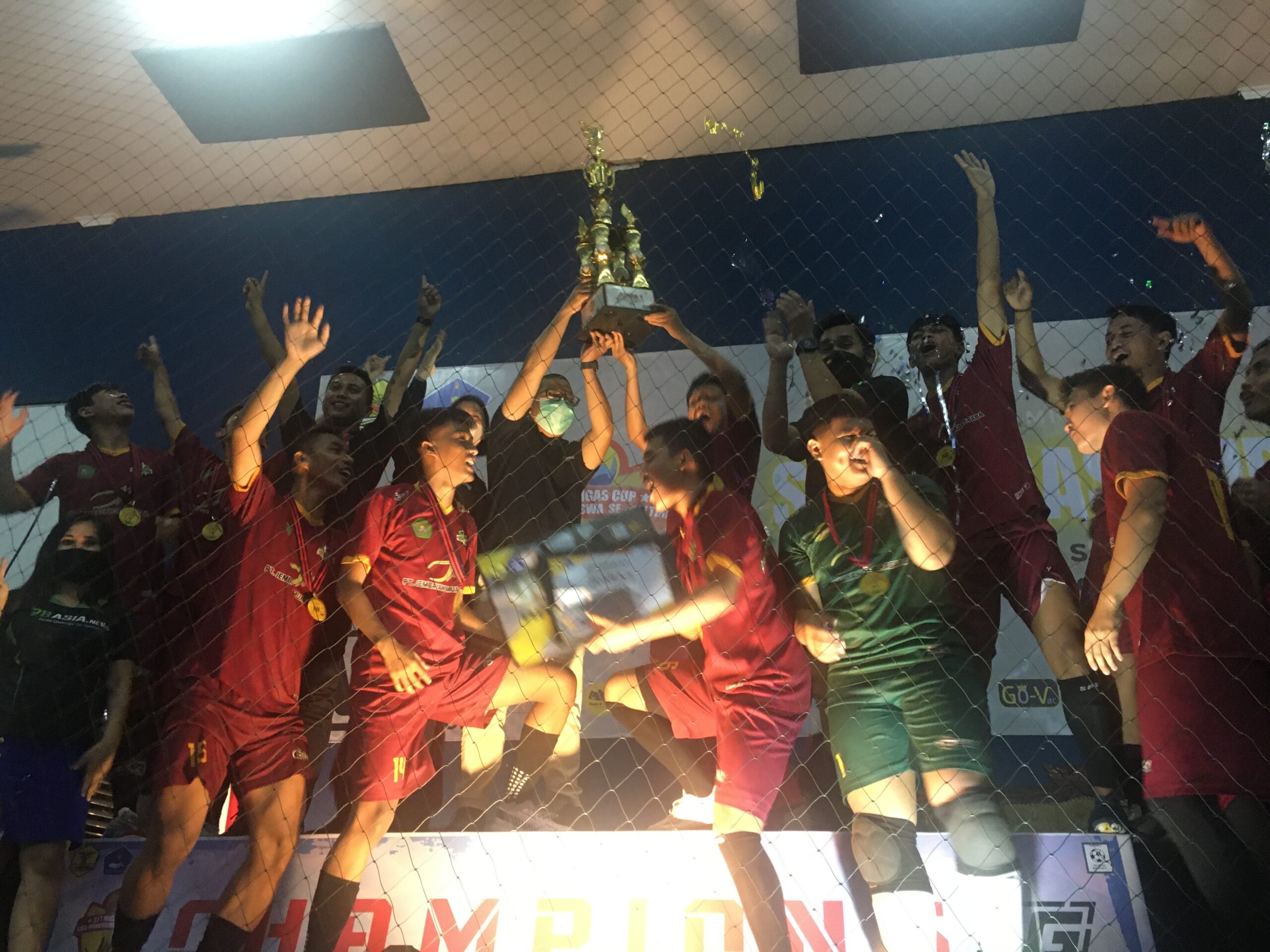 TIM JUARA: Para pemain Unmul mengangkat piala didampingi official, pelatih dan perwakilan manajemen STT Migas.