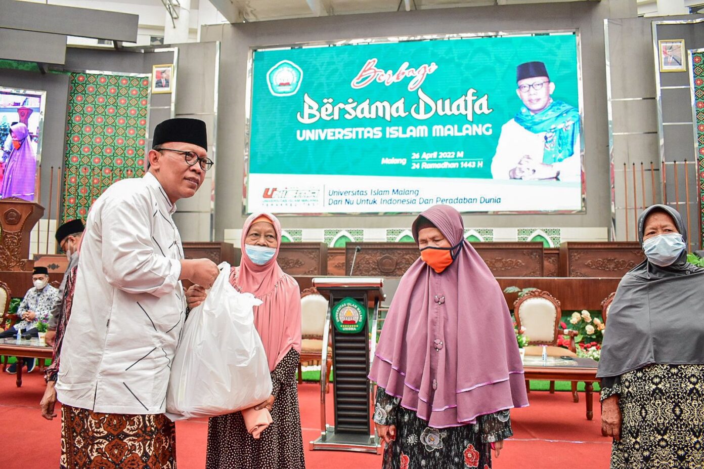 Hadir juga rektor dan para wakil rektor, para dekan bahkan ada pendiri yang juga menyaksikan kegiatan mulia tersebut. Wajah bahagia tampak dari wajah para duafa yang kemarin menerima bantuan. Mereka dari kalangan masakin dan janda-janda tua.