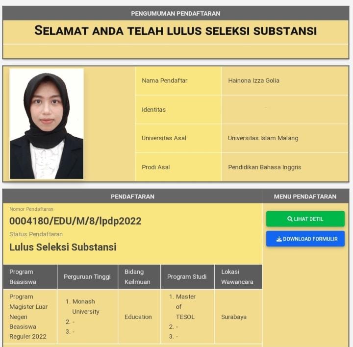 Pertama, kata Hainona, kuatkan niat dan jangan malas. “Dari dulu saya punya keinginan untuk dapetin beasiswa. Cuma nggak pernah action, sekedar ingin aja niatnya nggak kuat,” imbuhnya.