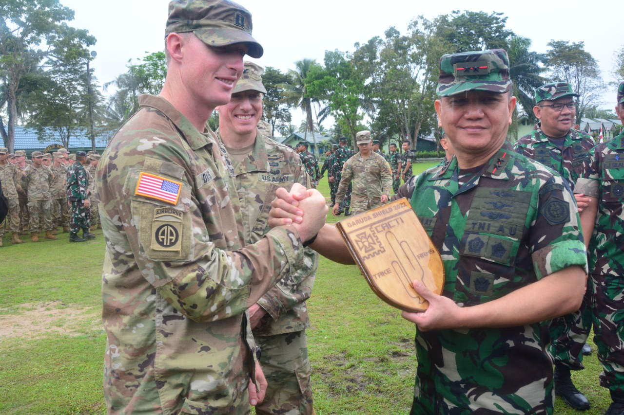 Di akhir upacara penutupan,  Wandankodiklat TNI dan Pangdam VI/Mlw serta tamu undangan yang lain memberikan cinderamata berupa pin Latgabma Super Garuda Shield dan Mandau kepada prajurit US Army.(**)