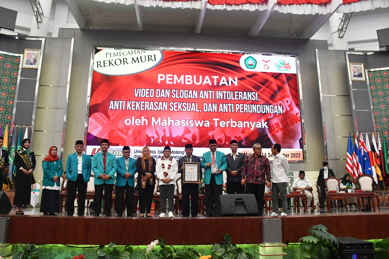 LINGKARANBERITA.COM, MALANG – Prestasi membanggakan terus diraih oleh Unisma. Kali ini dalam penutupan Orientasi Studi dan Kehidupan Kampus (Oshika) Maba, Unisma kembali meraih Rekor MURI. Rekor MURI tersebut diberikan kepada Unisma atas dasar pembuatan Video dan Slogan Anti Intoleransi, Kekerasan Seksual dan Perundungan terbanyak. Tercatat sebanyak 4527 mahasiswa baru yang berkontribusi dalam pembuatan video.