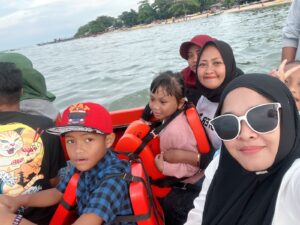 Tidak hanya berkumpul bersenda gurau melepas rindu, mereka juga ada yang menikmati beberapa fasilitas yang ada di pantai yang baru diresmikan sekitar 4 tahunan itu. Yakni mencoba wahana air Speedboat. “Seruuu, kita agendakan lagi tahun depan yah,” cetus Diana.