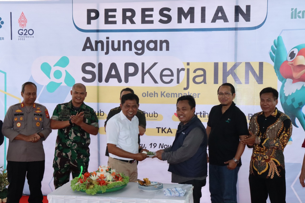 Anjungan SIAPKerja diresmikan Plt Bupati Penajam Paser Utara Hamdan Pongrewa, disaksikan jajaran rombongan Kemnaker dan FKPD PPU, Sabtu, 19/11/2022. Staf Khusus Menteri Ketenagakerjaan Caswiyono Rusydie Cakrawangsa dalam sambutannya pada peresmian kemarin, Anjungan SIAPKerja di Kawasan sekitar IKN ini merupakan dukungan Kemnaker kepada Pemerintah Kabupaten PPU yang menjadi titik pembangunan Kawasan IKN untuk memberikan layanan sistem informasi dan aplikasi berupa one stop services pelayanan terintegrasi bidang ketenagakerjaan bagi masyarakat.