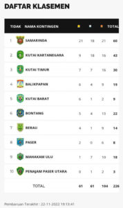 LINGKARANBERITA.COM, BERAU – Capaian medali atlet Kutai Timur cukup membanggakan. Tercatat sampai pukul 23.01 WITA, Selasa 22 November 2022, klasemen perolehan medali terus bergerak dinamis. Kontingen Kabupaten Kutim yang pada pukul 19.00 WITA sempat berada diurutan tiga besar, namun jelang beberapa jam harus turun ke posisi 5.