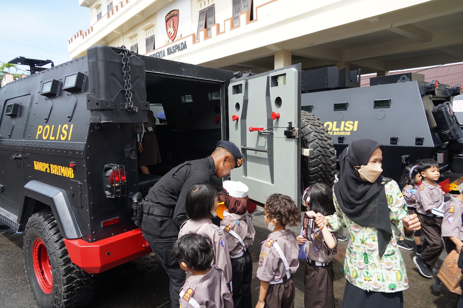 Murid-murid mendapat kesempatan untuk melihat secara langsung almatsus dan juga kendaraan dinas yang setiap harinya digunakan oleh Satbrimob Polda Kaltim dalam melaksanakan tugas sehari-hari.