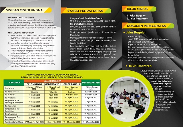 Perlu diperhatikan juga, untuk Program Studi Pendidikan Dokter, camaba harus lulus SMA/MA Jurusan IPA pada tahun 2021-2023. Untuk Prodi Farmasi, camaba harus merupakan lulusan SMA/MA Jurusan IPA atau SMK Jurusan Farmasi tahun 2021-2023. FK Unisma tidak menerima ijazah paket C dan ijazah Muadallah.