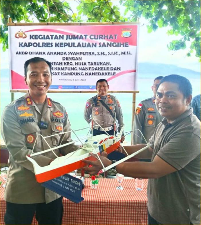 Lingkaranberita.com, Tahuna, Kepala Kepolisian Resort (Kapolres) Kepulauan Sangihe, AKBP Dhana Ananda Syahputra SH. SIK. M.Si, gelar Kegiatan Jumat Curhat, dengan Pemerintah Kecamatan Nusa Tabukan, lebih khusus di Kampung Nanedakele, Jumat (09/6/23).