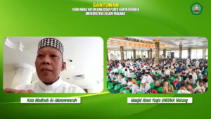 Rektor Unisma Prof. Dr. H. Maskuri, M.Si menyampaikan sambutan secara online. Live dari Kota Madinah Al-Munawwarah. Dia mengatakan Muharram merupakan salah satu bulan mulia setelah Bulan Suci Ramadan. Di bulan ini banyak peristiwa bersejarah. Terutama Tanggal 10 Muharram (Asyura).