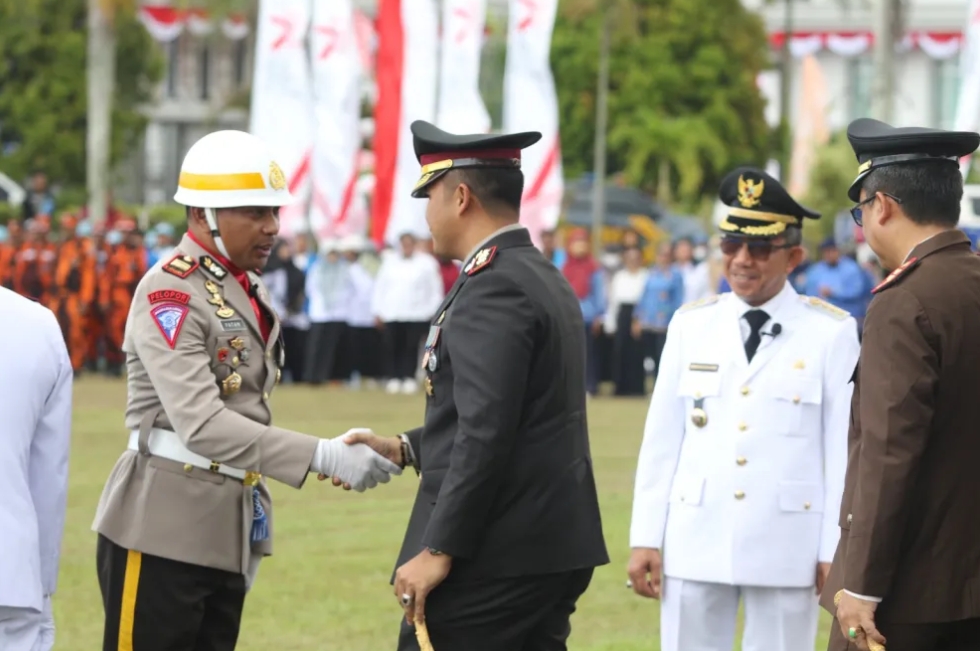 Ardiansyah Sulaiman didampingi Wakil Bupati Kasmidi Bulang, Ketua DPRD,Joni serta pimpinan Forkopimda turun ke lapangan upacara menemui dan berjabattangan dengan komandan upacara Ajun Komisaris Polisi (AKP) Isnan Fatah Ma’ruf.