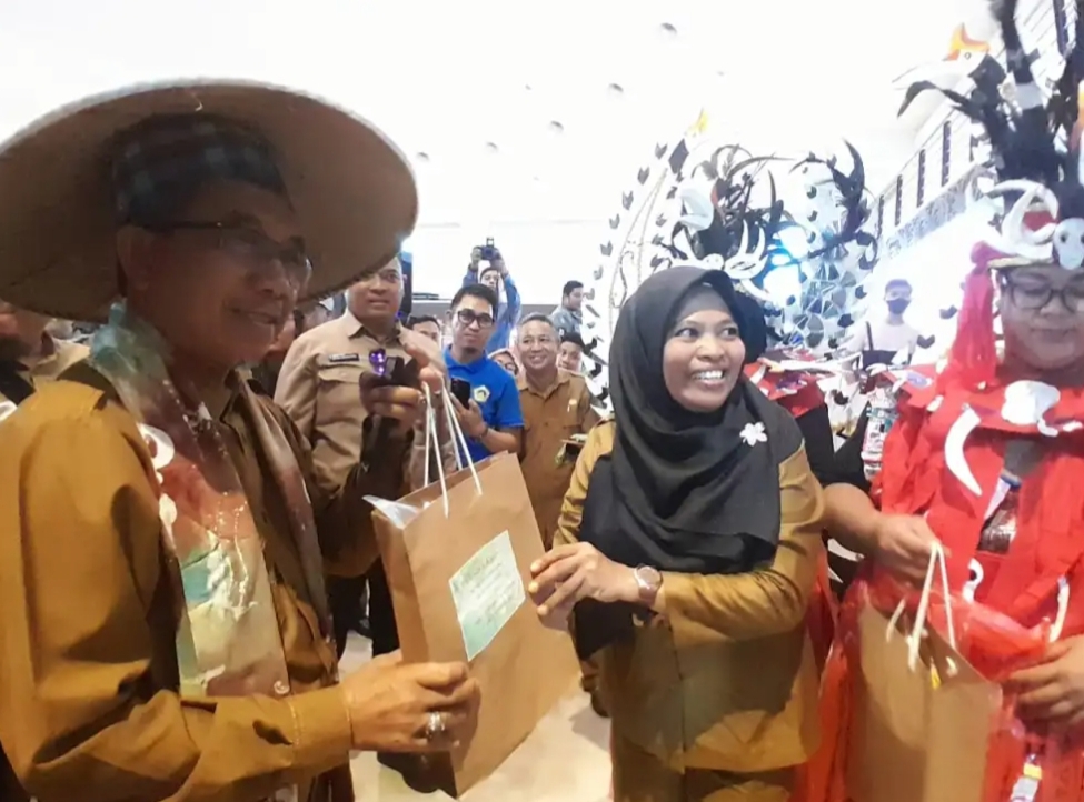 “Jadi sebelum memasuki stand Kecamatan Sangatta Utara, pengunjung disambut oleh 2 orang maskot, laki-laki dan perempuan dengan memakai gaun berbahan dasar plastik bekas bungkus sabun cuci dan lainnya,” kata Hasdiah.