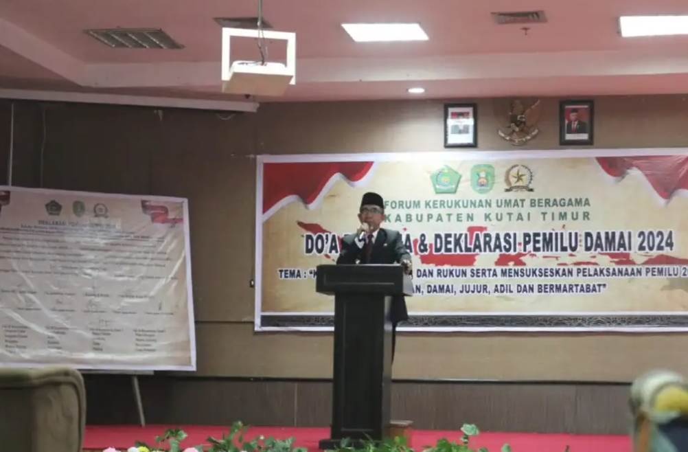 Lingkaranberita.com, SANGATTA – Bupati Kutai Timur (Kutim) Ardiansyah Sulaiman mengukuhkan Pengurus Forum Kerukunan Umat Beragama (FKUB) se- Kabupaten Kutim. Dalam kegiatan tersebut juga dirangkai dengan doa bersama dan deklarasi Pemilu Damai 2024. Kegiatan berlangsung di Ruang Pelangi Hotel Royal Victoria, Rabu (25/10/2023) pagi.