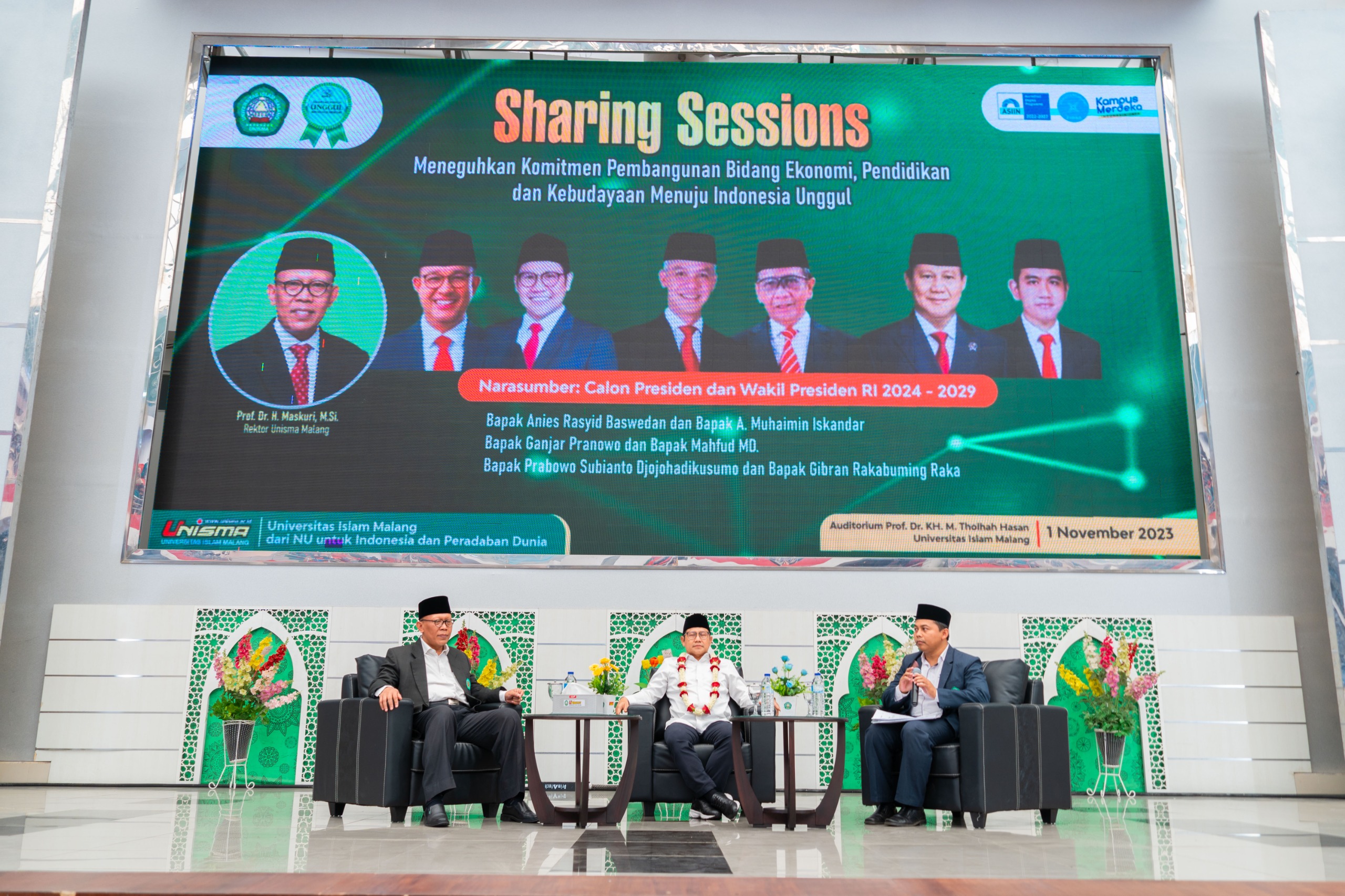 lingkaranberita.com, MALANG – Universitas Islam Malang (Unisma) menggagas kegiatan berupa sharing sessions bertemakan ‘Meneguhkan Komitmen Pembangunan Bidang Ekonomi, Pendidikan dan Kebudayaan Menuju Indonesia Unggul’ dengan menghadirkan seluruh bakal calon presiden dan bakal calon wakil presiden di Auditorium Prof. Dr. KH M. Tholhah Hasan, Rabu (1/11/2023).