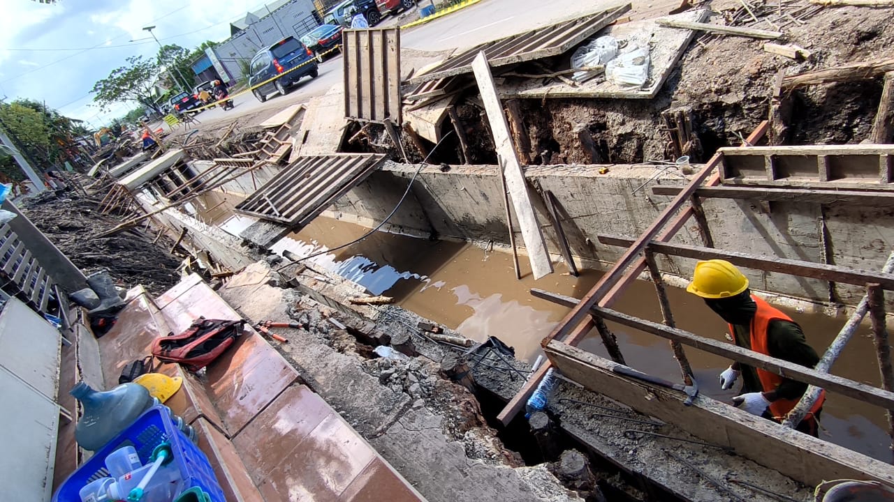 Mesin-mesin berat seperti excavator masih aktif menggali tanah untuk pengerukan lebih lanjut, sementara lalu lintas di sekitar area proyek tetap lancar, menandakan manajemen lalu lintas yang efektif.