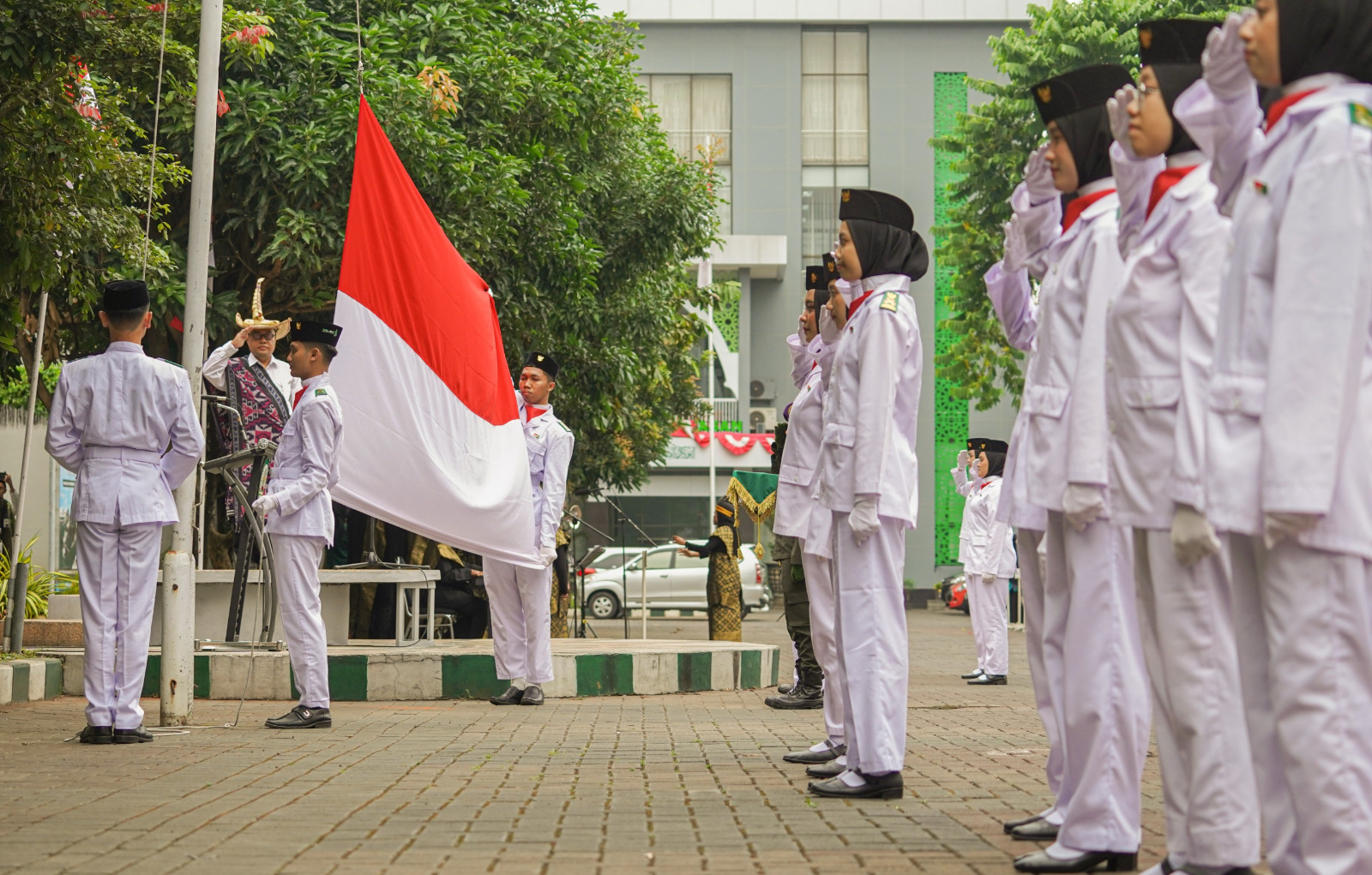 Upacara yang digelar di halaman Kampus Hijau kebanggaan Nahdlatul Ulama (NU) ini juga dimeriahkan oleh Pasukan Pengibar Bendera (Paskibra) yang berhasil mengibarkan Sang Saka Merah Putih dengan sempurna, diiringi lagu Indonesia Raya yang mengalun penuh khidmat.
