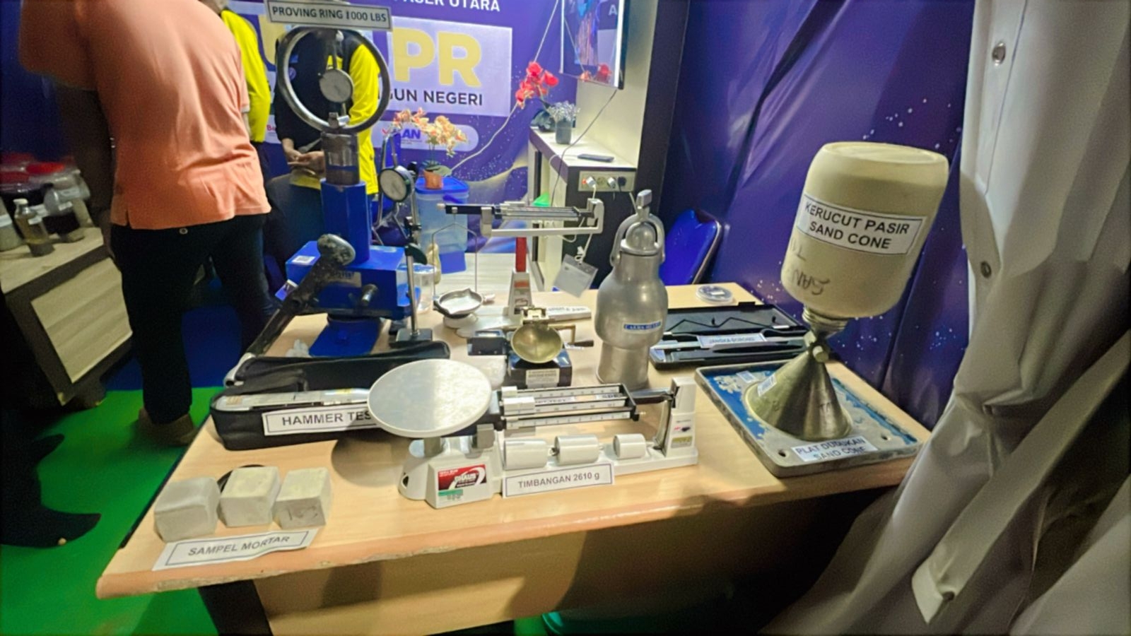 Stan yang berada di salah satu sudut strategis arena pameran tersebut diberi dekorasi khas warna institusional dengan kombinasi biru-kuning dan dipenuhi peralatan uji laboratorium konstruksi seperti hammer test, proving ring 1000 lbs, timbangan presisi 2610 gram, hingga perangkat kerucut pasir (sand cone) yang digunakan dalam uji kepadatan tanah di lapangan.