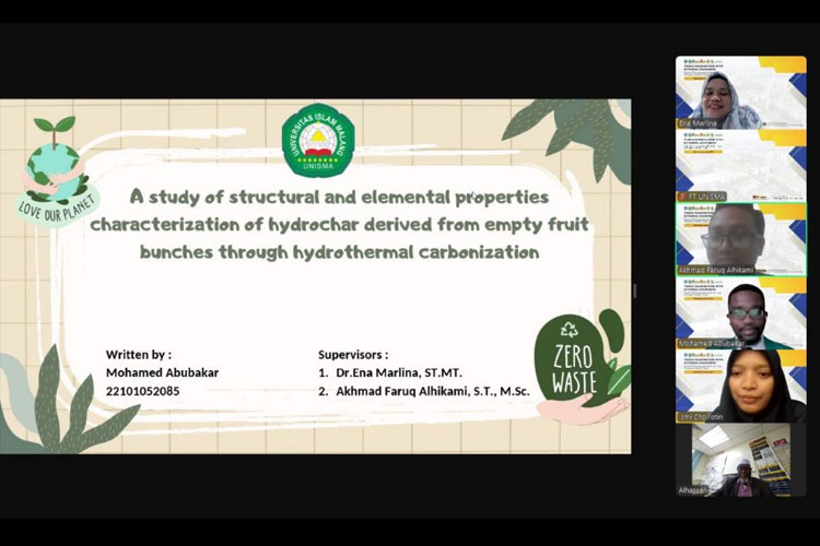 Skripsi yang diangkat oleh Abubakar berjudul “A Study of Structural and Elemental Properties Characterization of Hydrochar Derived from Empty Fruit Bunches Through Hydrothermal Carbonization”. Penelitian ini berfokus pada karakterisasi struktur dan unsur dari hidrokar yang dihasilkan melalui proses karbonisasi hidrotermal tandan kosong kelapa sawit (EFB), sebuah limbah biomassa yang potensial dikembangkan sebagai sumber energi terbarukan.